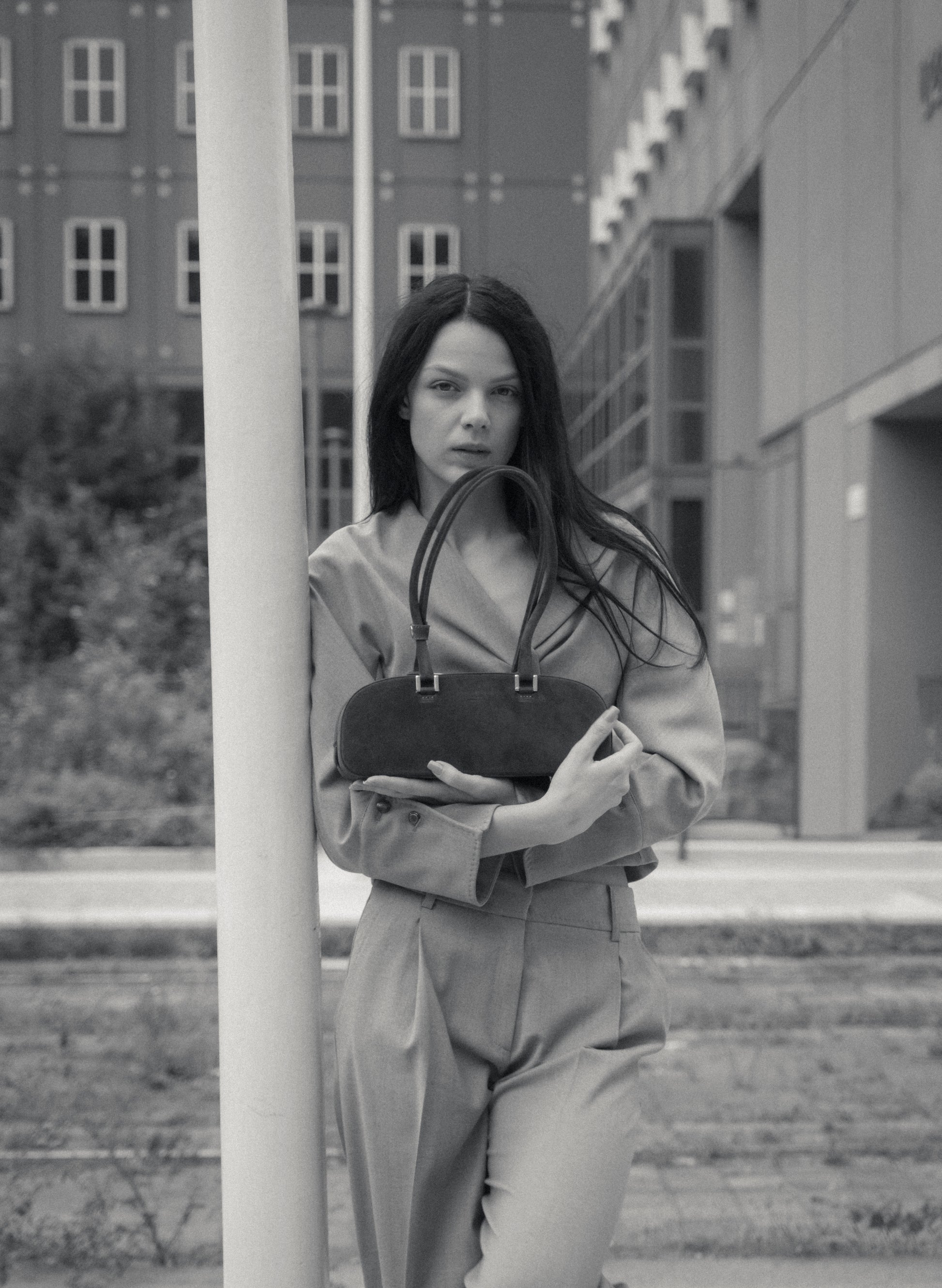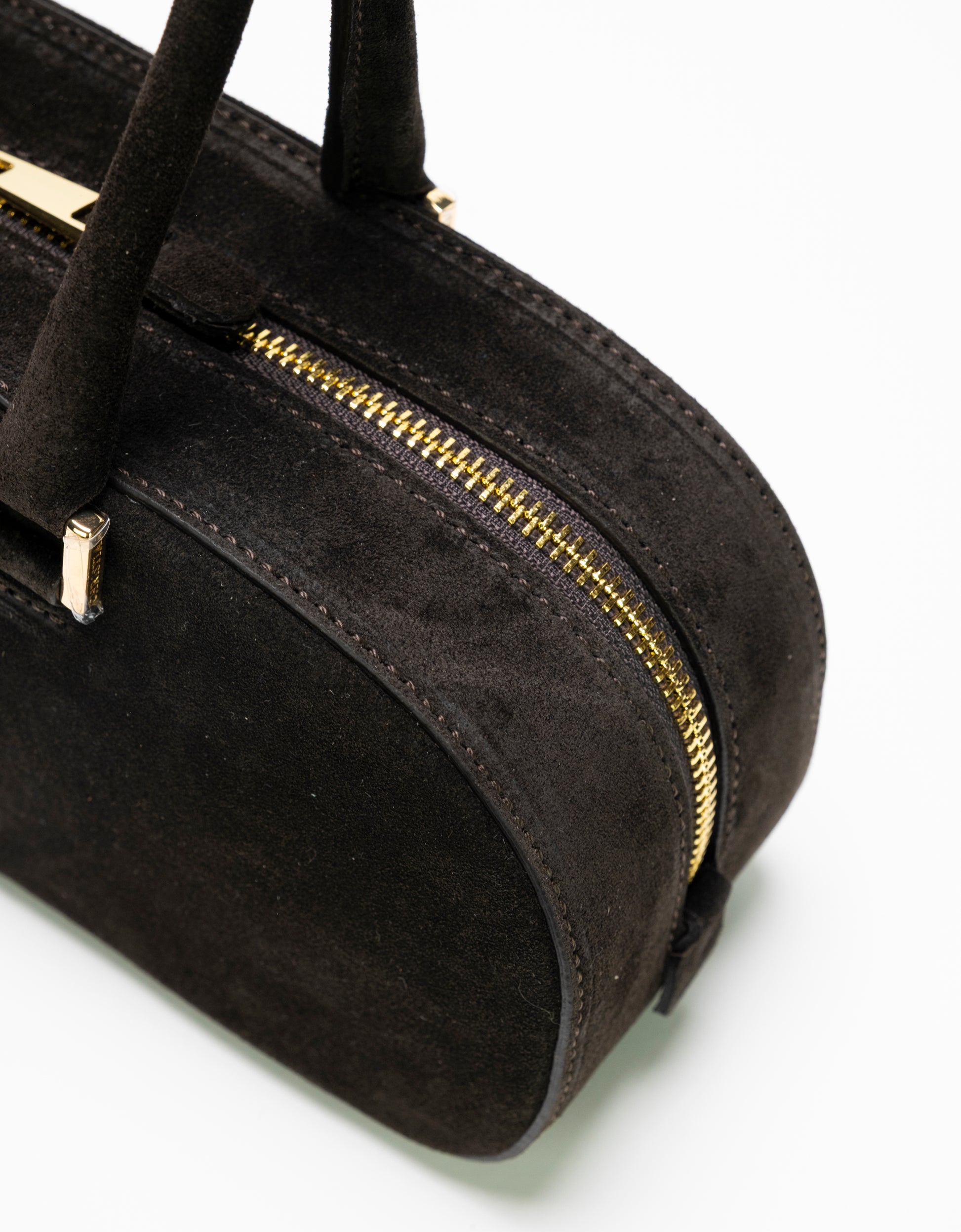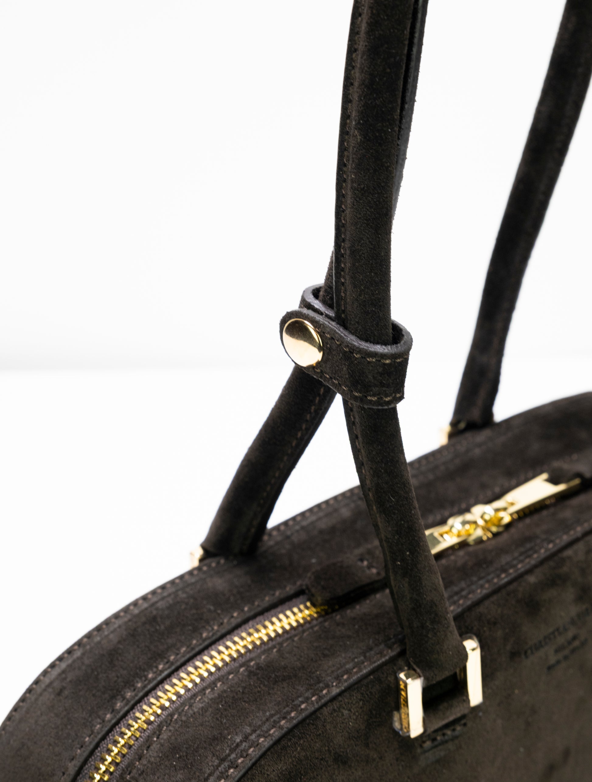 Questa borsa è realizzata in pelle scamosciata. La pelle scamosciata naturale è ricavata da pelle di vitello, levigata per ottenere una finitura vellutata. Questo processo rende il tessuto particolarmente morbido al tatto e altamente resistente.