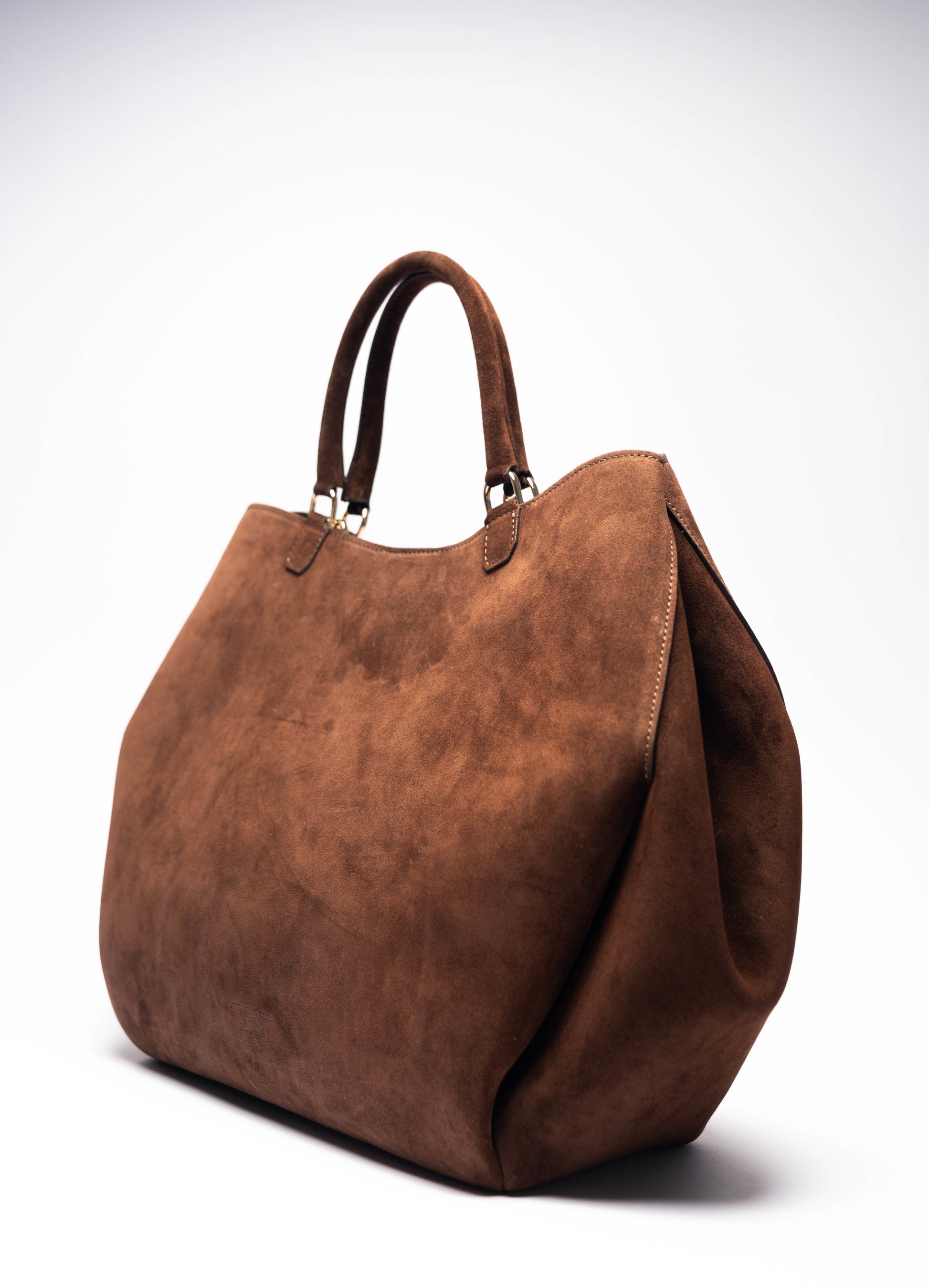 このバッグはスエード素材を使用しています。天然スエードはカーフレザーから作られ、ベルベットのような風合いに仕上げるために研磨加工が施されています。この加工により、非常に柔らかな手触りと高い耐久性を実現しています。